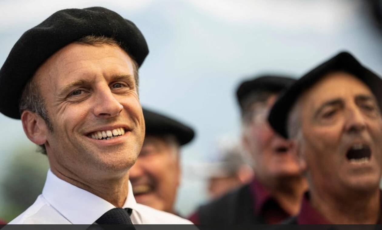 Με ένα μπερέ στο κεφάλι και ένα αμήχανο γέλιο, ο Εμανουέλ Μακρόν συνόδευσε μία παραδοσιακή χορωδία βοσκών κατά τη διάρκεια της επίσκεψής του στο Argelès-Gazost στα Πυρηναία. Περιτριγυρισμένος από μια ντουζίνα κτηνοτρόφους, ο Γάλλος πρόεδρος που έχασε πρόσφατα την πλειοψηφία στην Εθνοσυνέλευση, επιδόθηκε σε ένα παραδοσιακό τραγούδι των Πυρηναίων. Προηγουμένως οι ντόπιοι του είχαν χαρίσει έναν μπερέ που φορούσε περήφανα.