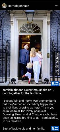 Η Κάρι Τζόνσον ευχαρίστησε επίσης το προσωπικό της Ντάουνινγκ Στριτ, για την καλοσύνη τους, ειδικά προς τα παιδιά της.