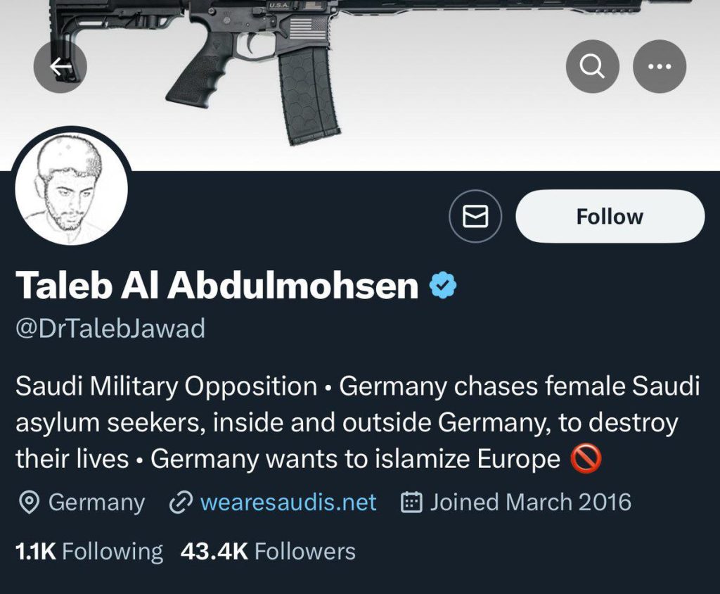 Στο προφίλ του στο Twitter ξεχωρίζει ένα αυτόματο όπλο που έχει σαν κεντρική φωτογραφία και ενώ σε μια καρφιτσωμένη ανάρτηση, κάνει λόγο για «σειρά εσκεμμένων εγκλημάτων των γερμανικών Αρχών κατά των Σαουδάραβων προσφύγων» και απειλεί, λέγοντας πως «σας διαβεβαιώνω ότι η εκδίκηση θα έρθει 100% σύντομα».