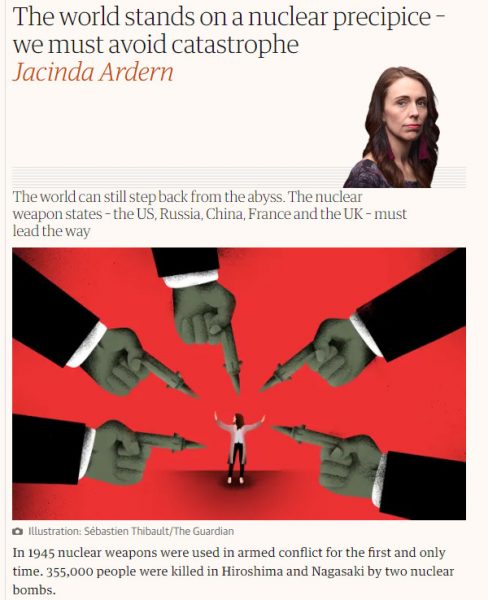 «Η Νέα Ζηλανδία καλεί τα κράτη με πυρηνικά όπλα -τις ΗΠΑ, τη Ρωσία, την Κίνα, τη Γαλλία και το Ηνωμένο Βασίλειο- να απομακρυνθούν από την πυρηνική άβυσσο και να παράσχουν αυτή την ηγετική θέση, δεσμευόμενοι να διαπραγματευτούν ένα νέο πολυμερές πλαίσιο πυρηνικού αφοπλισμού» γράφει στον Guardian η πρωθυπουργός εξηγώντας γιατί μία τόσο γεωγραφικά ευνοημένη χώρα όπως η Νέα Ζηλανδία ανησυχεί τόσο πολύ για το συγκεκριμένο θέμα.