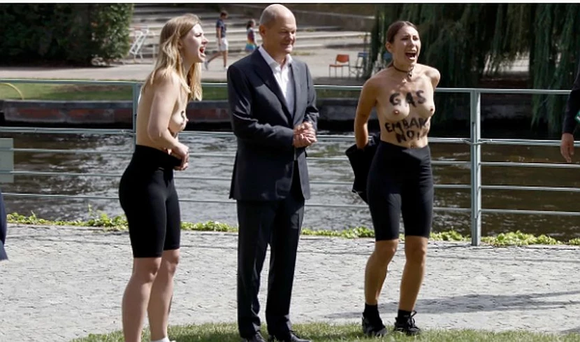 Δύο ακτιβίστριες αιφνιδίασαν τον καγκελάριο της Γερμανίας Όλαφ Σολτς, με τον οποίο ζήτησαν να φωτογραφηθούν, καθώς γύμνωσαν τα στήθη τους απαιτώντας «εμπάργκο στο ρωσικό φυσικό αέριο, τώρα», λόγω της επίθεσης της Ρωσίας στην Ουκρανία.