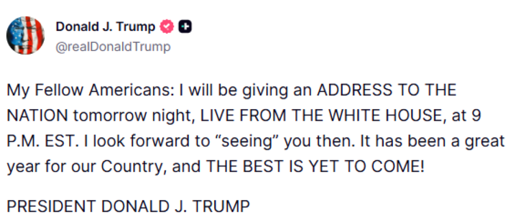 «Αμερικανοί συμπολίτες μου: θα απευθύνω διάγγελμα προς το έθνος αύριο το βράδυ, απευθείας από τον Λευκό Οίκο, στις 21.00.