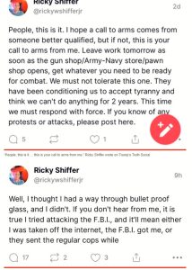 Αμερικανικά μέσα ενημέρωσης δημοσίευσαν φωτογραφίες από την οθόνη του λογαριασμού που υπάρχει στο όνομα του υπόπτου, τον οποίο η αστυνομία κατονόμασε ως Ρίκι Σίφερ, 42 ετών, στις οποίες γράφει “Αυτό είναι πρόσκληση στα όπλα”.