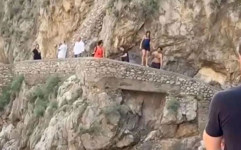 Η γυναίκα, η οποία στεκόταν στην κορυφή ενός βράχου στο Fiordo di Furore στην Ιταλία, φαινόταν να σκέφτεται αν θα κάνει το ριψοκίνδυνο άλμα όταν έχασε την ισορροπία της.