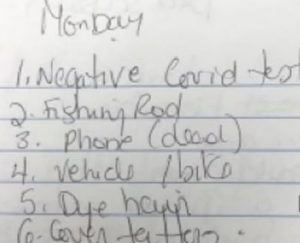 Μετά από έρευνα στο αυτοκίνητό της αποκαλύφθηκε πως είχε κρατήσει σημειώσεις που έδειχναν πως είχε σχεδιάσει την εξαφάνισή της. Σε μια λίστα πραγμάτων που θα έπρεπε να κάνει ήταν σημειωμένα: 1. Αρνητικό τεστ κορωνοϊού, 2. Καλάμι ψαρέματος, 3.Τηλέφωνο (νεκρό), 4. Ποδήλατο/ όχημα, 5. Βάψιμο μαλλιών, 6. Κάλυψη τατουάζ.
