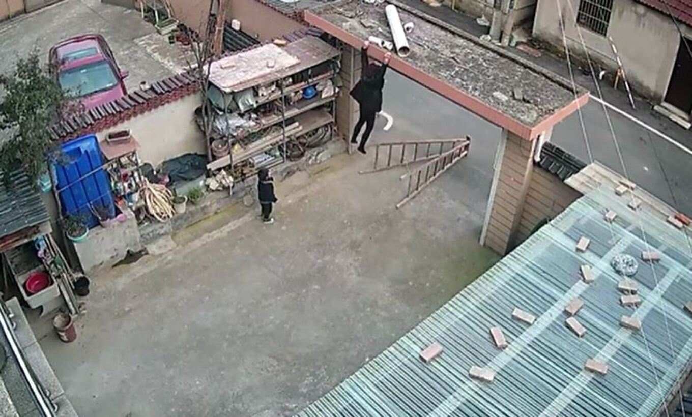 Τη στιγμή όμως που έφτασε στην κορυφή, η ξύλινη σκάλα έπεσε στο έδαφος, με αποτέλεσμα η γυναίκα να κρατιέται με τις άκρες των δαχτύλων της.