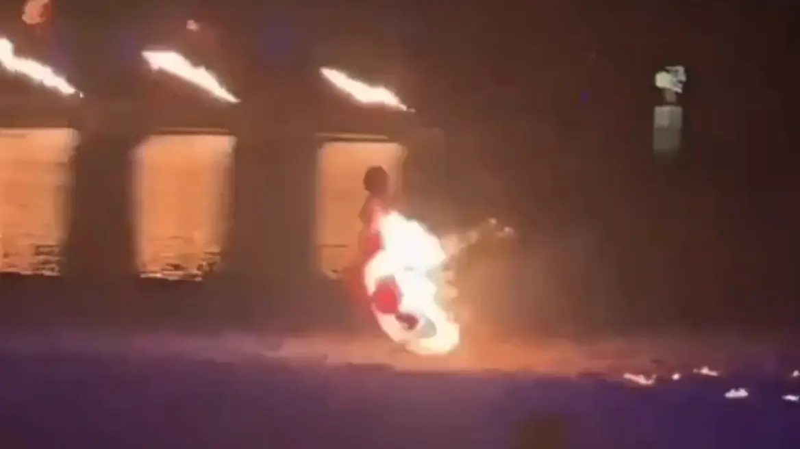 Ωστόσο, η κατάσταση ξέφυγε από τον έλεγχο, καθώς οι φλόγες επεκτάθηκαν και στο ύφασμα του φορέματος, αρχίζοντας να ανεβαίνουν προς την πλάτη της.
