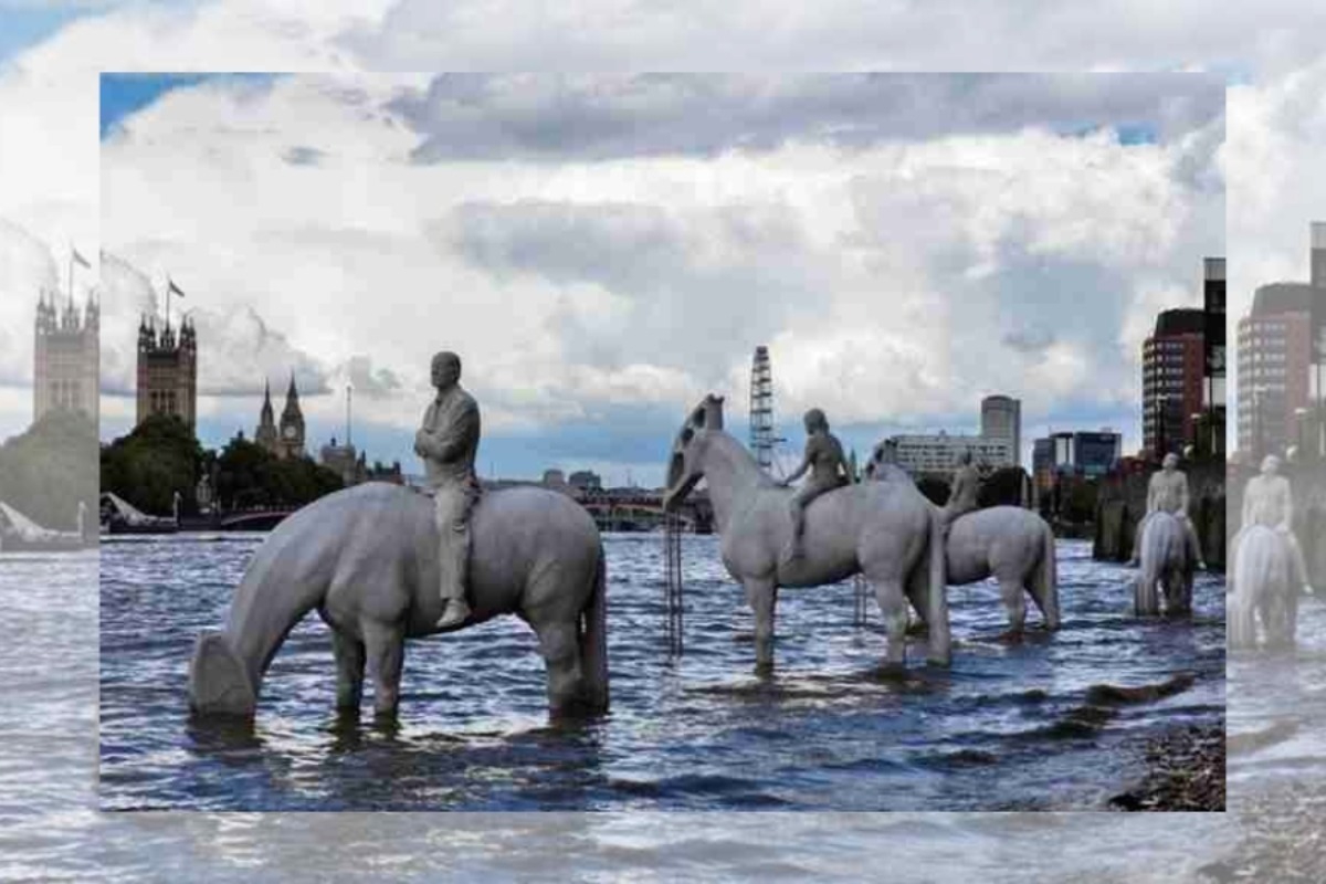Καθώς το νερό υποχωρεί, τέσσερις επιβλητικές φιγούρες ξεπροβάλλουν από τον Τάμεση. Μια εικόνα που μοιάζει βγαλμένη από ταινία: σκιές, άλογα, ανθρώπινες μορφές – όλα καλυμμένα με την υγρή πατίνα του ποταμού.