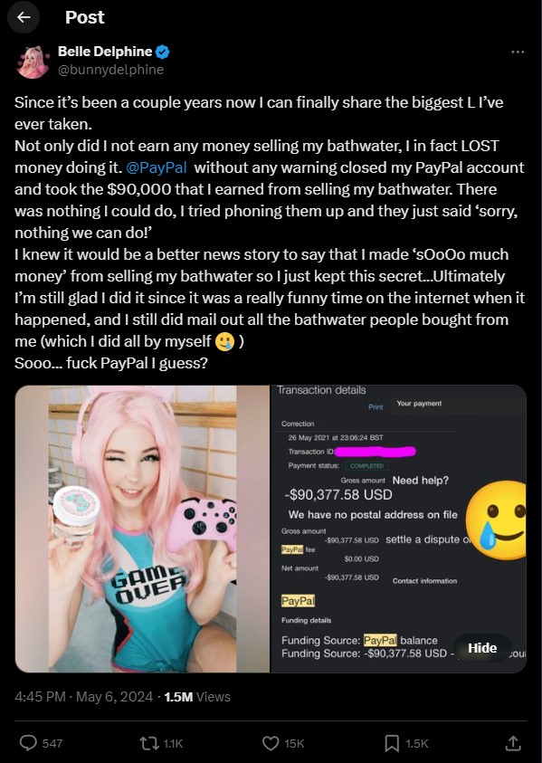 Μέσα από το X, η Belle Delphine, το πραγματικό όνομα της οποίας είναι Mary-Belle Kirschner, εξιστόρησε την πραγματική ιστορία. «Η PayPal, χωρίς καμία προειδοποίηση, έκλεισε τον λογαριασμό μου και πήρε τα 83.000 ευρώ που κέρδισα από την πώληση του νερού της μπανιέρας μου», έγραψε. Η ξαφνική κατάσχεση των εσόδων της σήμαινε ότι η Kirschner, παρά την viral επιτυχία δεν είδε κανένα οικονομικό όφελος.