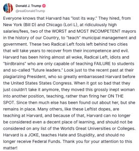 «Το Χάρβαρντ είναι ένα ΑΝΕΚΔΟΤΟ που διδάσκει το μίσος και την ηλιθιότητα και δεν θα έπρεπε να λαμβάνει πλέον ομοσπονδιακά κεφάλαια», δήλωσε ο Αμερικανός Πρόεδρος Ντόναλντ Τραμπ μέσω του Truth Social.