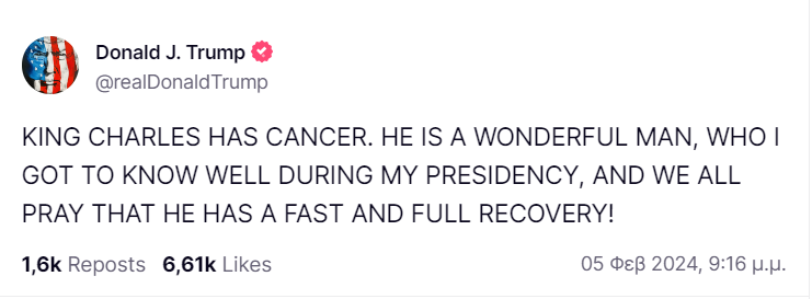 Ο Ντόναλντ Τραμπ, έστειλε το δικό του μήνυμα στον βασιλιά Κάρολο Γ’, μετά την ανακοίνωση ότι διαγνώστηκε με καρκίνο.