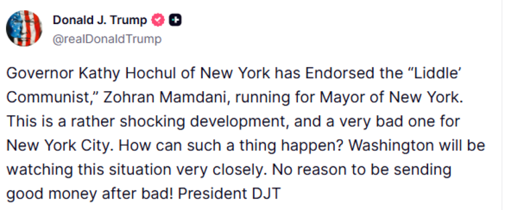 Mε νέα ανάρτησή του στην πλατφόρμα του Truth Social, ο πρόεδρος των ΗΠΑ, Ντόναλντ Τραμπ αναφέρθηκε κατά της Κάθι Χόκουλ για την υποστήριξή της στον Ζοχράν Μαμντάνι, υποψήφιο με τους Δημοκρατικούς, για την δημαρχία της Νέας Υόρκης.