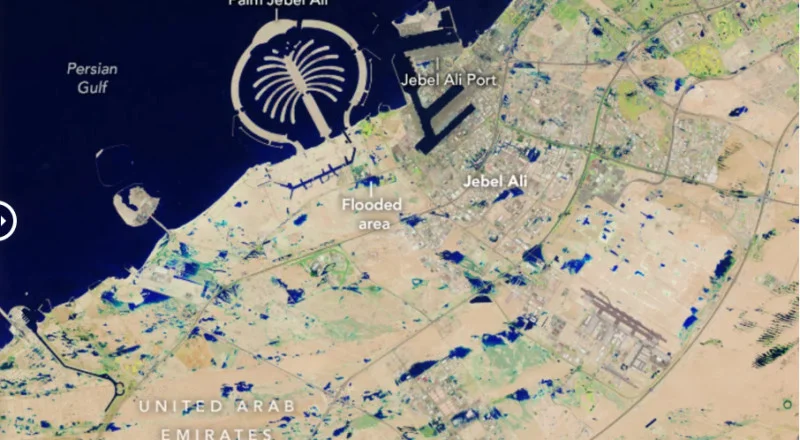 Ο δορυφόρος Landsat 9 πέρασε πάνω από τα Ηνωμένα Αραβικά Εμιράτα την Παρασκευή (19/4) και κατέγραψε εικόνες από τις μεγάλες πλημμύρες, σε λιγότερο από δύο ημέρες αφότου υποχώρησε η βροχή.