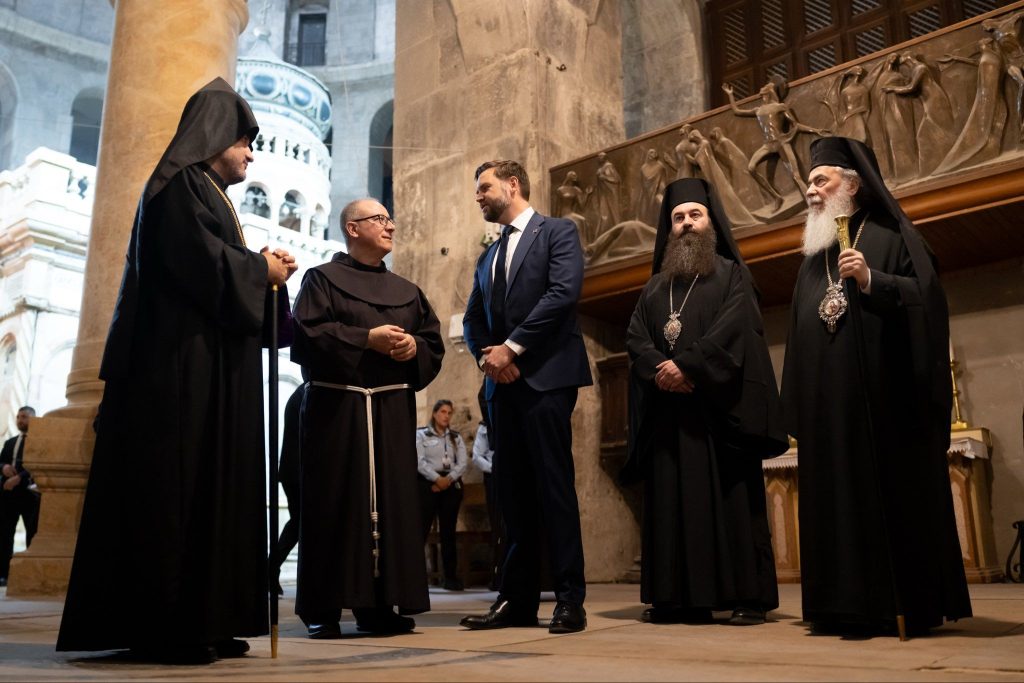 Κατά την επίσκεψή του στον Ναό της Αναστάσεως, ο Τζέι Ντι Βανς συνοδευόταν από ιεράρχες διάφορων χριστιανικών δογμάτων, όπως επίσης και από τον Πατριάρχη Ιεροσολύμων, κ.κ. Θεόφιλο.