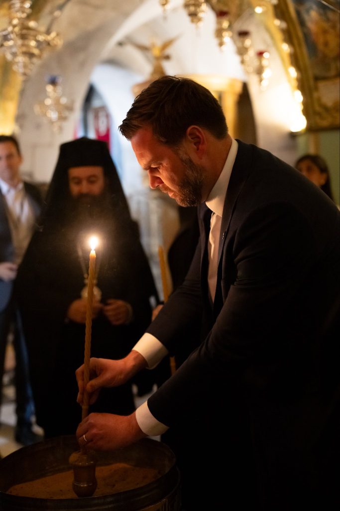 Κατά την επίσκεψή του στον Ναό της Αναστάσεως, ο Τζέι Ντι Βανς συνοδευόταν από ιεράρχες διάφορων χριστιανικών δογμάτων, όπως επίσης και από τον Πατριάρχη Ιεροσολύμων, κ.κ. Θεόφιλο.