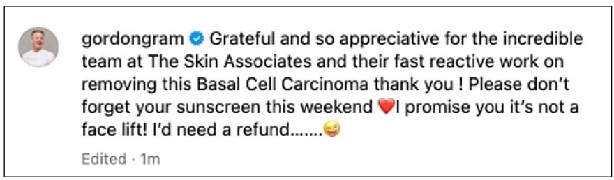 Ο Γκόρντον προειδοποίησε επίσης τους followers του για τη σημασία της χρήσης αντηλιακού για την πρόληψη οποιασδήποτε μορφής καρκίνου του δέρματος.