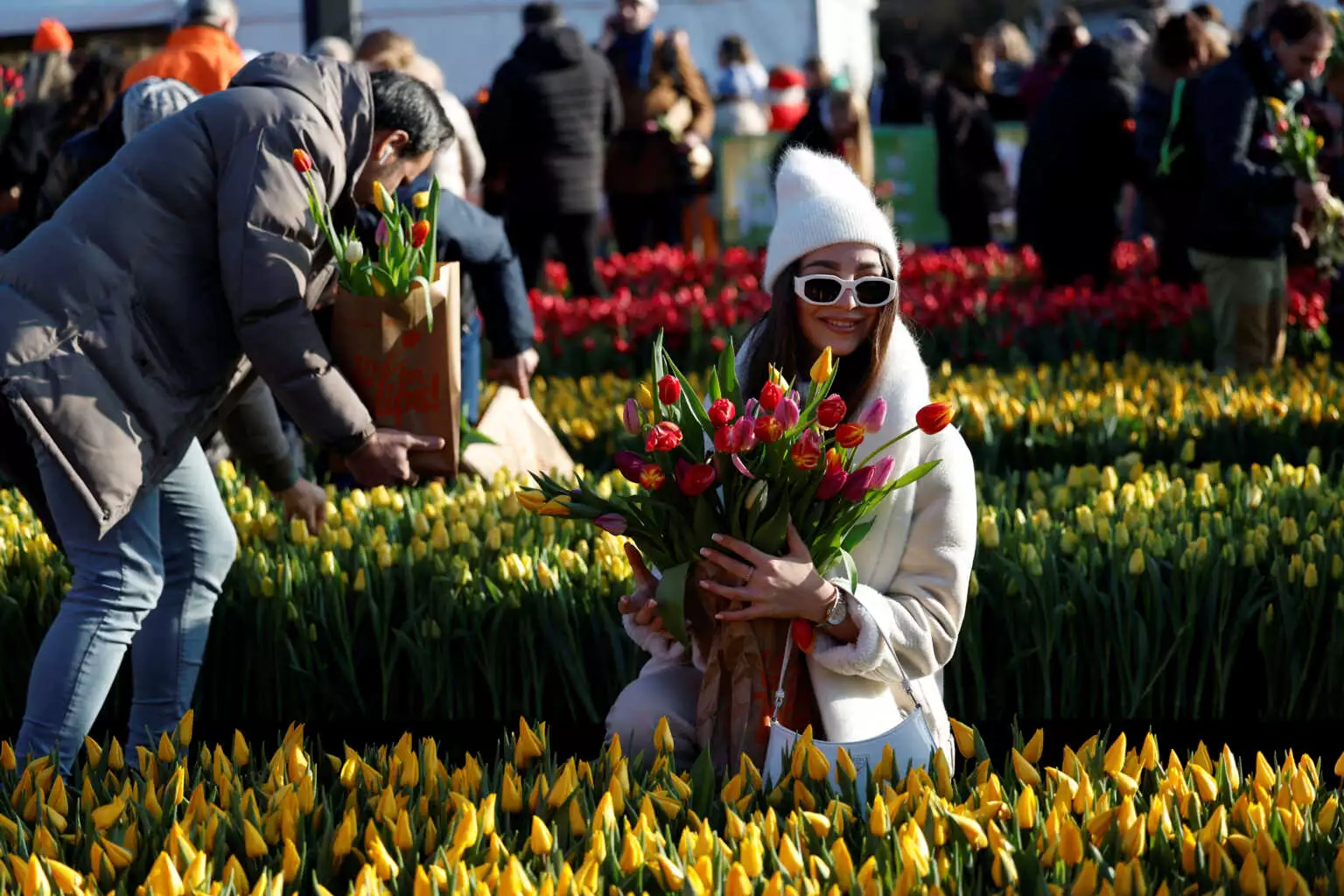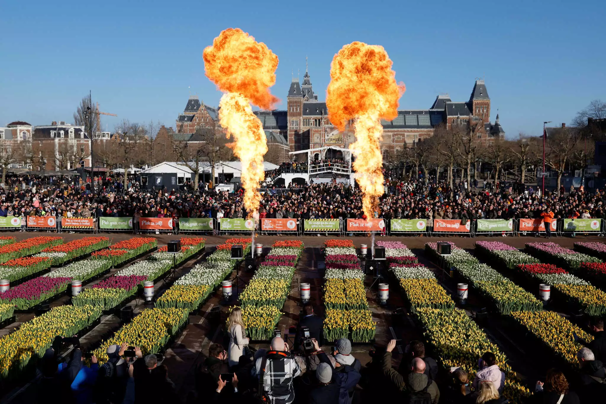 Πλήθος κόσμου έδωσε το παρών, ενώ οι καλλιεργητές τουλίπας δημιούργησαν έναν πολύχρωμο κήπο από 200.000 τουλίπες στην πλατεία Museumplein – αναπαράγοντας μια λεπτομέρεια από τον πίνακα του Johannes Vermeer Mistress and Maid.
