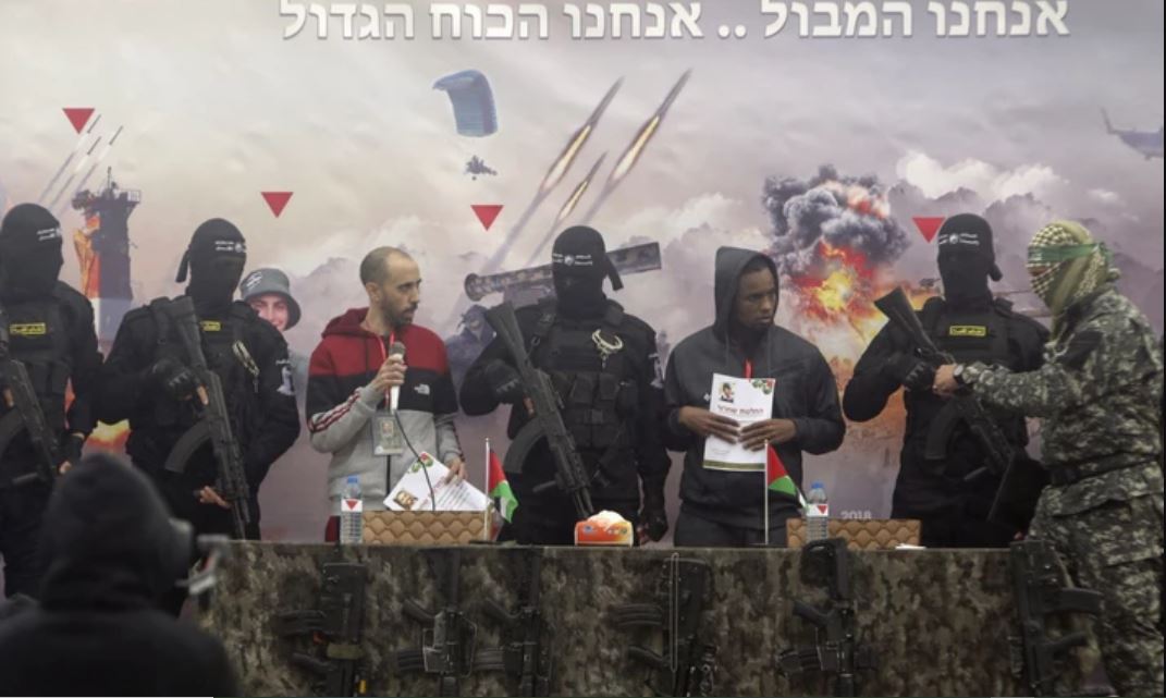 Ο Ταλ Σοχάμ και ο Αβέρα Μενγκίστου ήταν οι πρωταγωνιστές ενός «σόου» επίδειξης προηγουμένως σε εξέδρα από κουκουλοφόρους της Χαμάς πριν παραδοθούν στα μέλη του Διεθνούς Ερυθρού Σταυρού.
