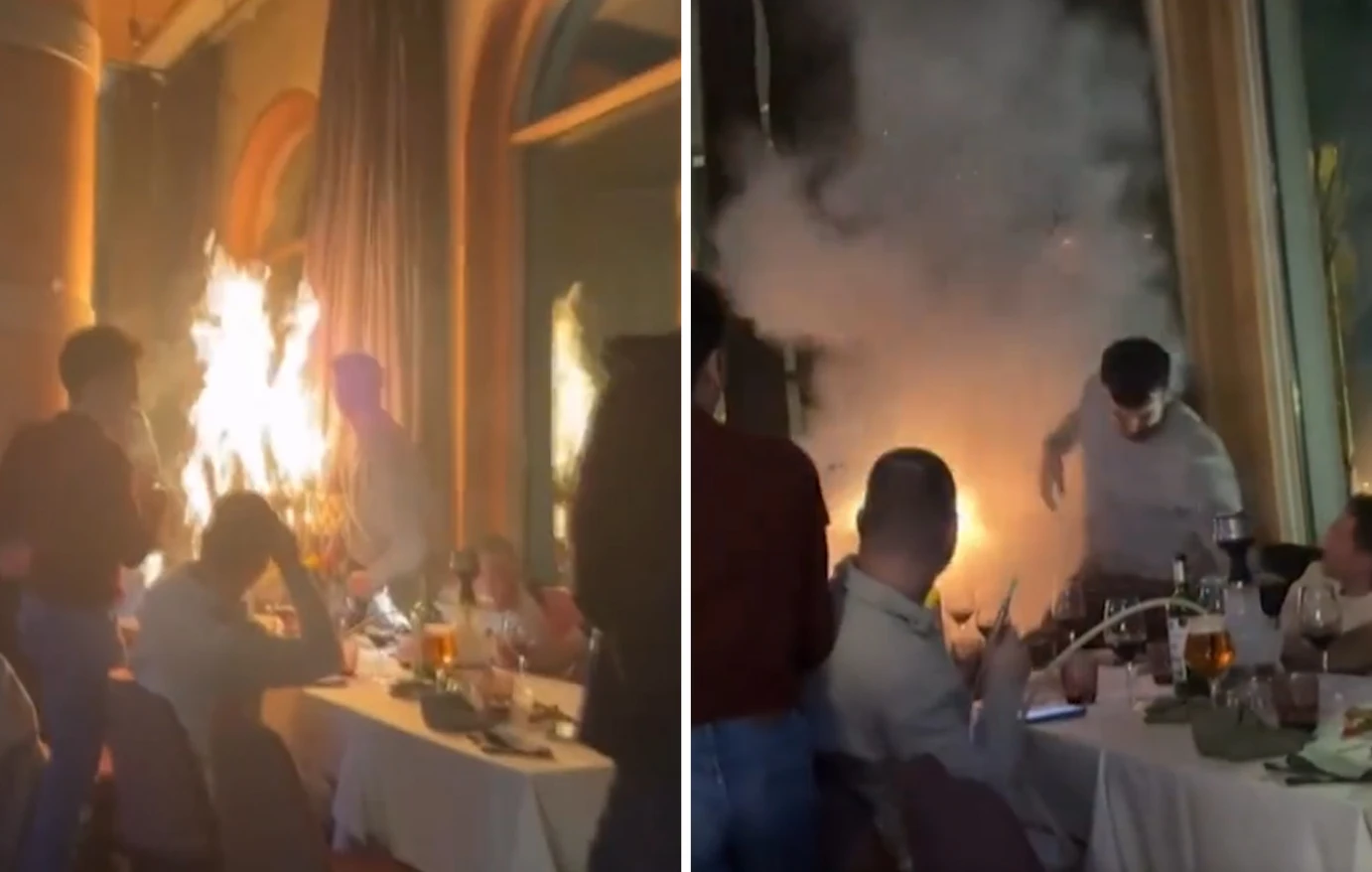 Στα πλάνα διακρίνεται μια κουρτίνα να παίρνει φωτιά τη στιγμή που πελάτες του εστιατορίου κρατούν πυροτεχνήματα εσωτερικού χώρου και τα κραδαίνουν στον ρυθμό της μουσικής, την ώρα που χορεύτριες παρουσιάζουν ένα σόου πάνω στο μπαρ. Ένας σερβιτόρος αρπάζει πολύ γρήγορα έναν πυροσβεστήρα για να σβήσει τη φωτιά.