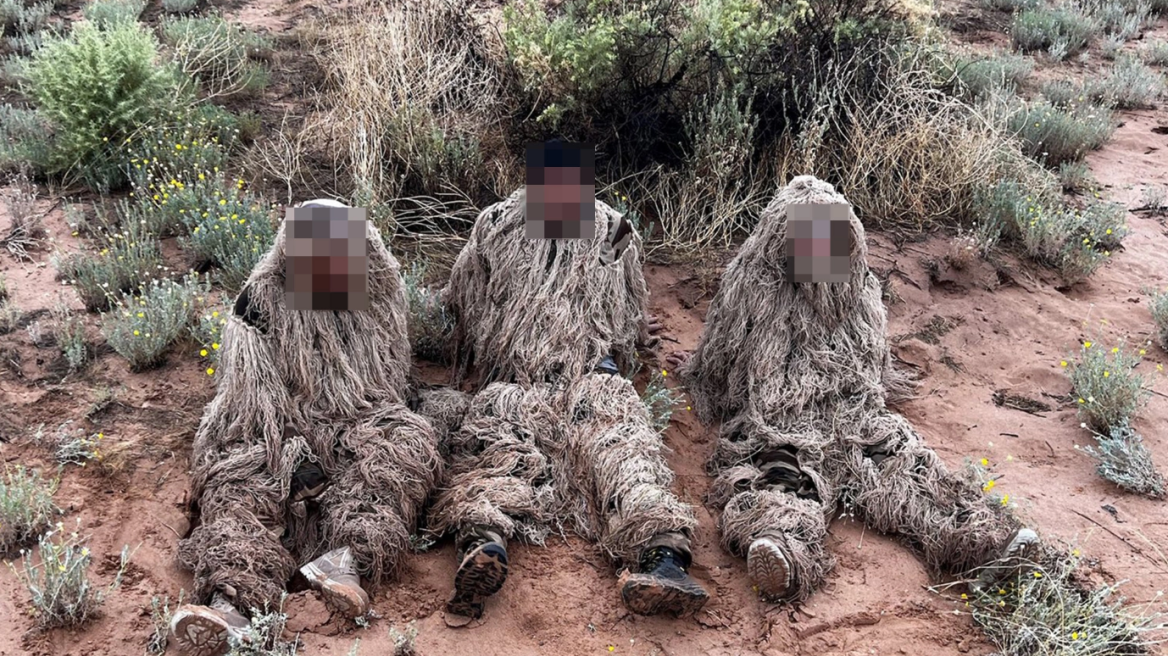 Οι φωτογραφίες που δημοσιεύτηκαν στους λογαριασμούς κοινωνικής δικτύωσης της Συνοριακής Περιπολίας δείχνουν τους τρεις άνδρες να φορούν τα λεγόμενα κοστούμια καμουφλάζ, τα οποία χρησιμοποιούνται συχνά από κυνηγούς.
