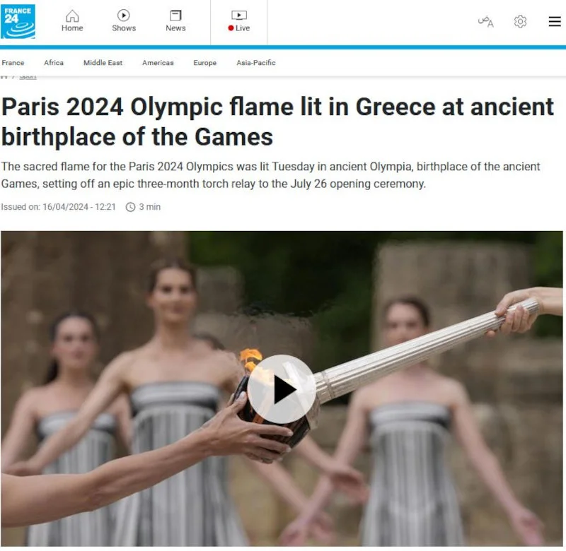«Η Ολυμπιακή Φλόγα για τους Αγώνες του 2024 στο Παρίσι άναψε στην αρχαία γενέτειρά τους, στην Ελλάδα, δίνοντας το έναυσμα για μια επική λαμπαδηδρομία, διαρκείας τριών μηνών, μέχρι την τελετή έναρξης της 26ης Ιουλίου», μετέδωσε το δίκτυο France 24 .