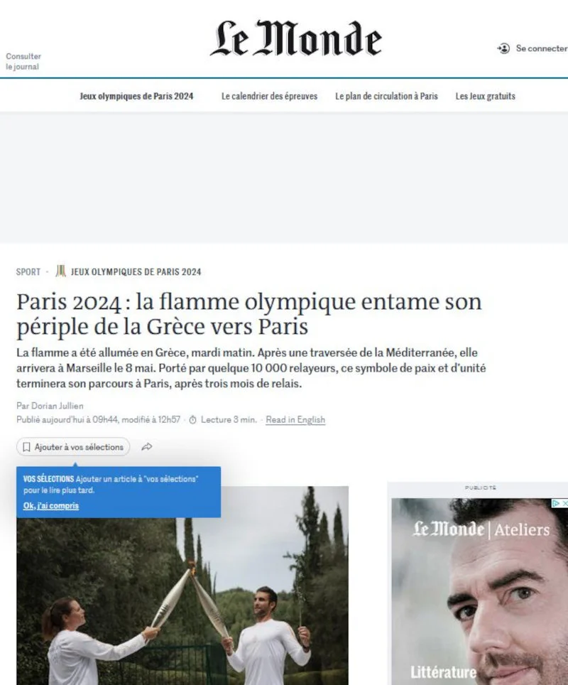 «Παρίσι 2024: Η Ολυμπιακή Φλόγα ξεκινά το ταξίδι της από την Ελλάδα στο Παρίσι», αναφέρει η εφημερίδα Le Monde.