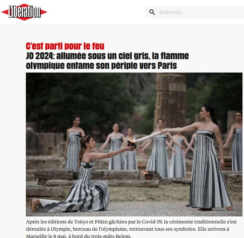 «Oλυμπιακοί Αγώνες 2024: Άναψε κάτω από γκρι ουρανό η Ολυμπιακή φλόγα», γράφει η Liberation.
