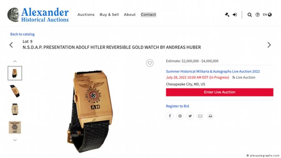 Στο ρολόι του οίκου Huber, που κατέληξε στα χέρια ανώνυμου πλειοδότη, υπάρχει χαραγμένη μια σβάστικα και τα αρχικά Α Χ.