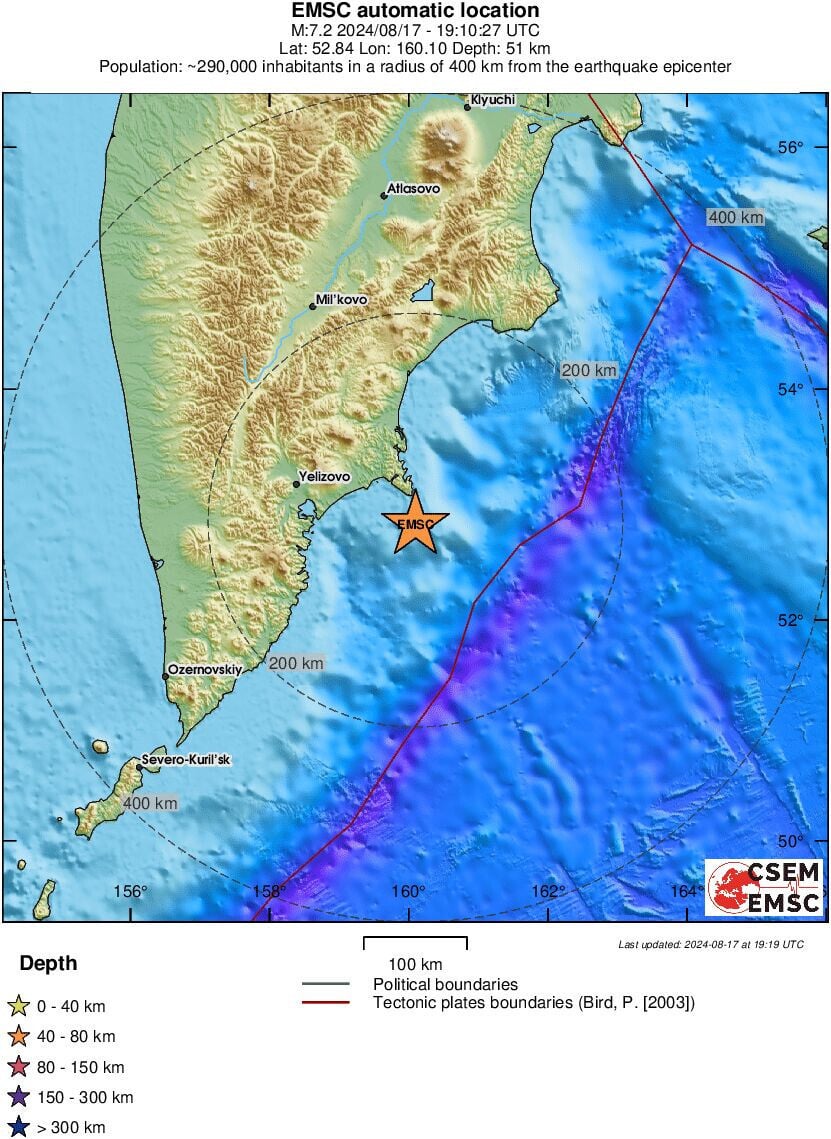 Ισχυρός σεισμός μεγέθους μεγέθους 7,2 βαθμών της κλίμακας Ρίχτερ, σημειώθηκε το βράδυ του Σαββάτου (17/8) στα ανοιχτά της Καμτσάτκα, στη Ρωσία.