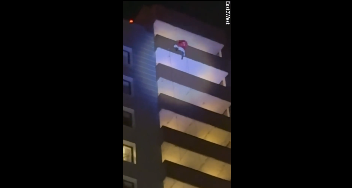 Σε αυτά φαίνεται ο επαγγελματίας αναρριχητής να προσπαθεί να κατέβει στο κτήριο με σχοινιά για να χαιρετήσει τα παιδιά από κάτω.