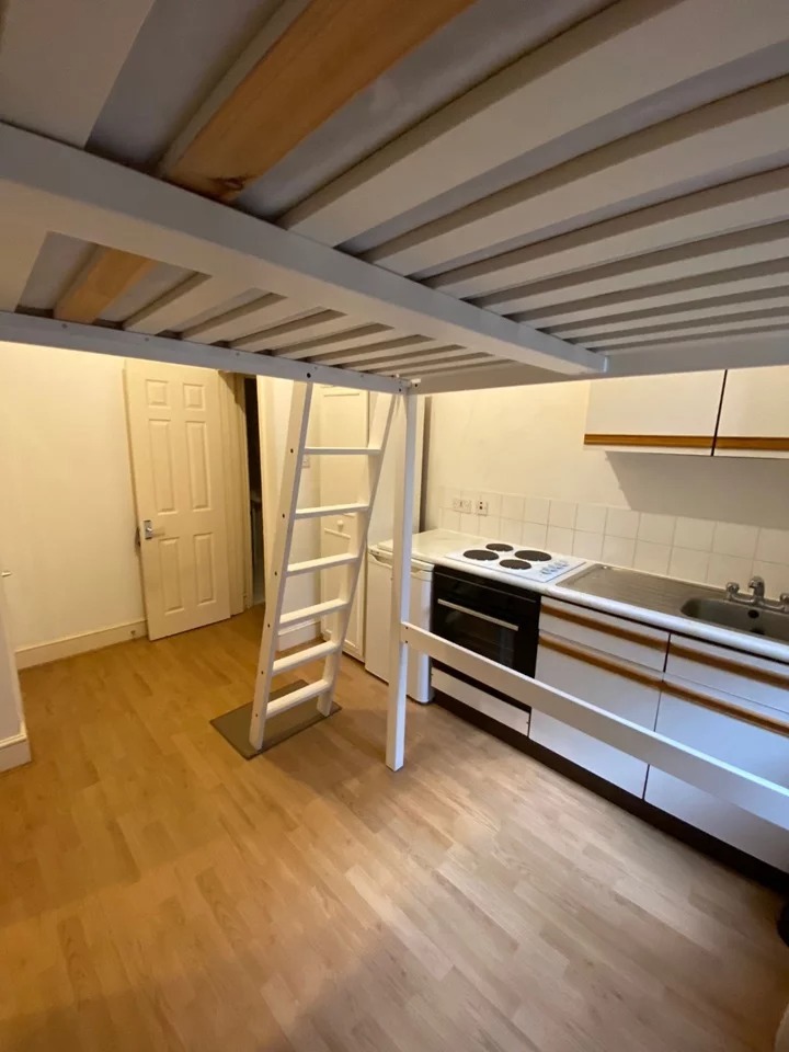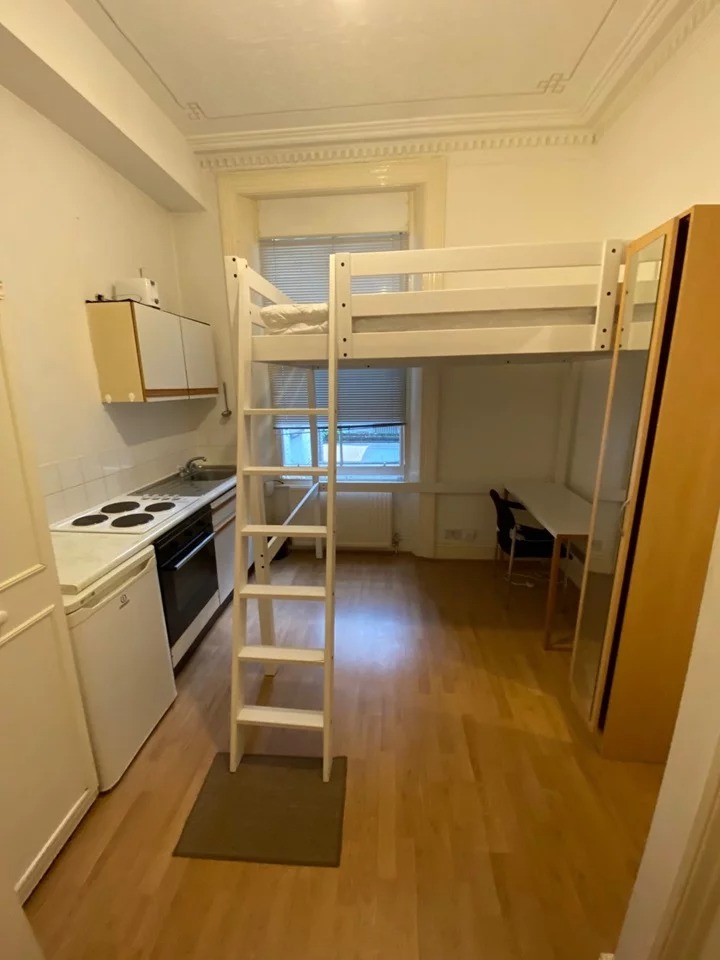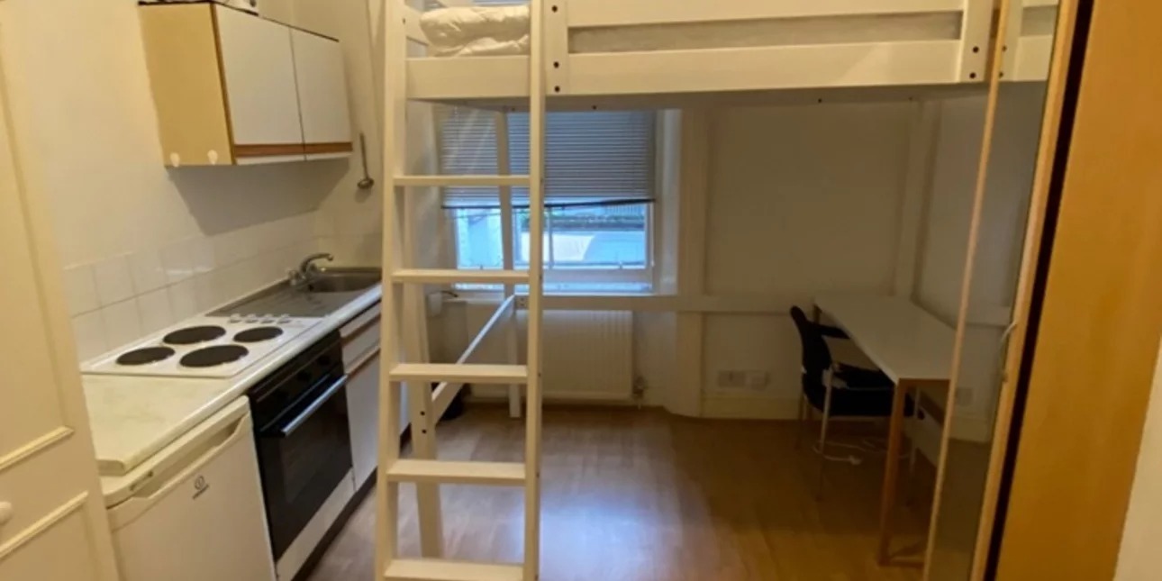 Ευτυχώς, η σκάλα που οδηγεί στο κρεβάτι, δεν εμποδίζει στο άνοιγμα της πόρτας του ψυγείου. Επίσης, το μικρό στούντιο στην αριστοκρατική συνοικία του Λονδίνου, διαθέτει ξεχωριστό ντους και τουαλέτα.