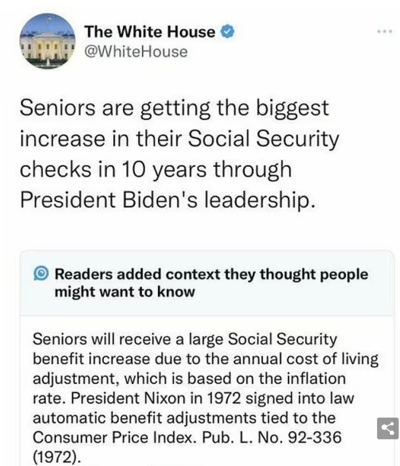 Μόλις «ανέβηκε» το συγκεκριμένο tweet, οι παρατηρητικοί πρόσεξαν ότι δεν επρόκειτο για μία αύξηση που δόθηκε λόγω της «ηγεσίας Μπάιντεν», αλλά ήταν το αποτέλεσμα της μεγάλης αύξησης του πληθωρισμού που ενεργοποίησε έναν νόμο του Νίξον το 1972, που προβλέπει μία «αυτόματη τιμαριθμική αναπροσαρμογή» για τις συντάξεις και τα επιδόματα όταν υπάρχουν μεγάλες αυξήσεις στις τιμές!