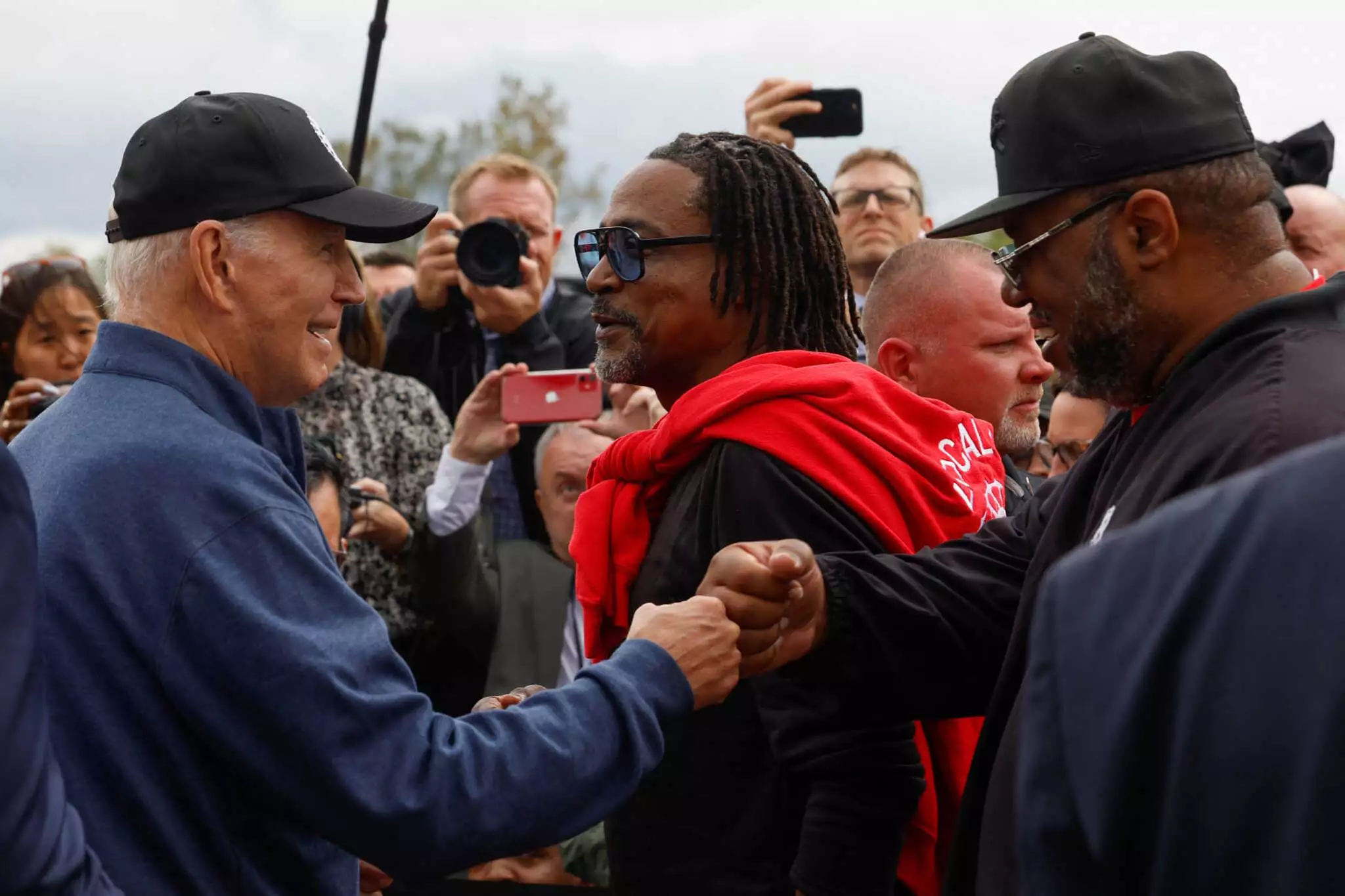 Φορώντας ένα κασκέτο με το λογότυπο του συνδικάτου των εργαζομένων στην αυτοκινητοβιομηχανία (UAW), ο Δημοκρατικός πρόεδρος των ΗΠΑ απευθύνθηκε στους απεργούς, μιλώντας τους με μία ντουντούκα.