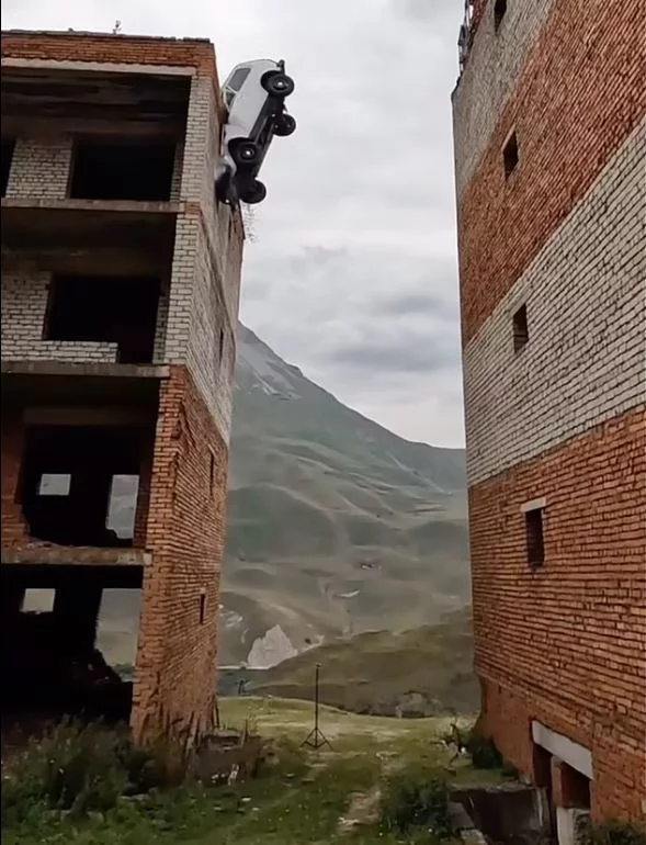 Όμως, ο Ρώσος κασκαντέρ έκανε έναν καταστροφικό λάθος υπολογισμό και δεν κατάφερε να επιταχύνει αρκετά ώστε να περάσει απέναντι. Το αυτοκίνητο έπεσε στο έδαφος από ύψος 15 μέτρων περίπου, αφότου πρώτα χτύπησε με όλη του τη δύναμη στον τοίχο του απέναντι κτιρίου.