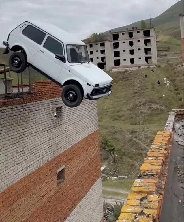 Όπως μπορεί να δει κανείς στο βίντεο, ο Τσεμποτάρεφ είχε τοποθετήσει μία ξύλινη ράμπα στην ταράτσα μιας πολυκατοικίας προκειμένου προφανώς να πάρει φόρα και να κάνει βουτιά στον αέρα με τον λευκό Lada Niva του και να προσγειωθεί στην ταράτσα του τρίτου κτιρίου.