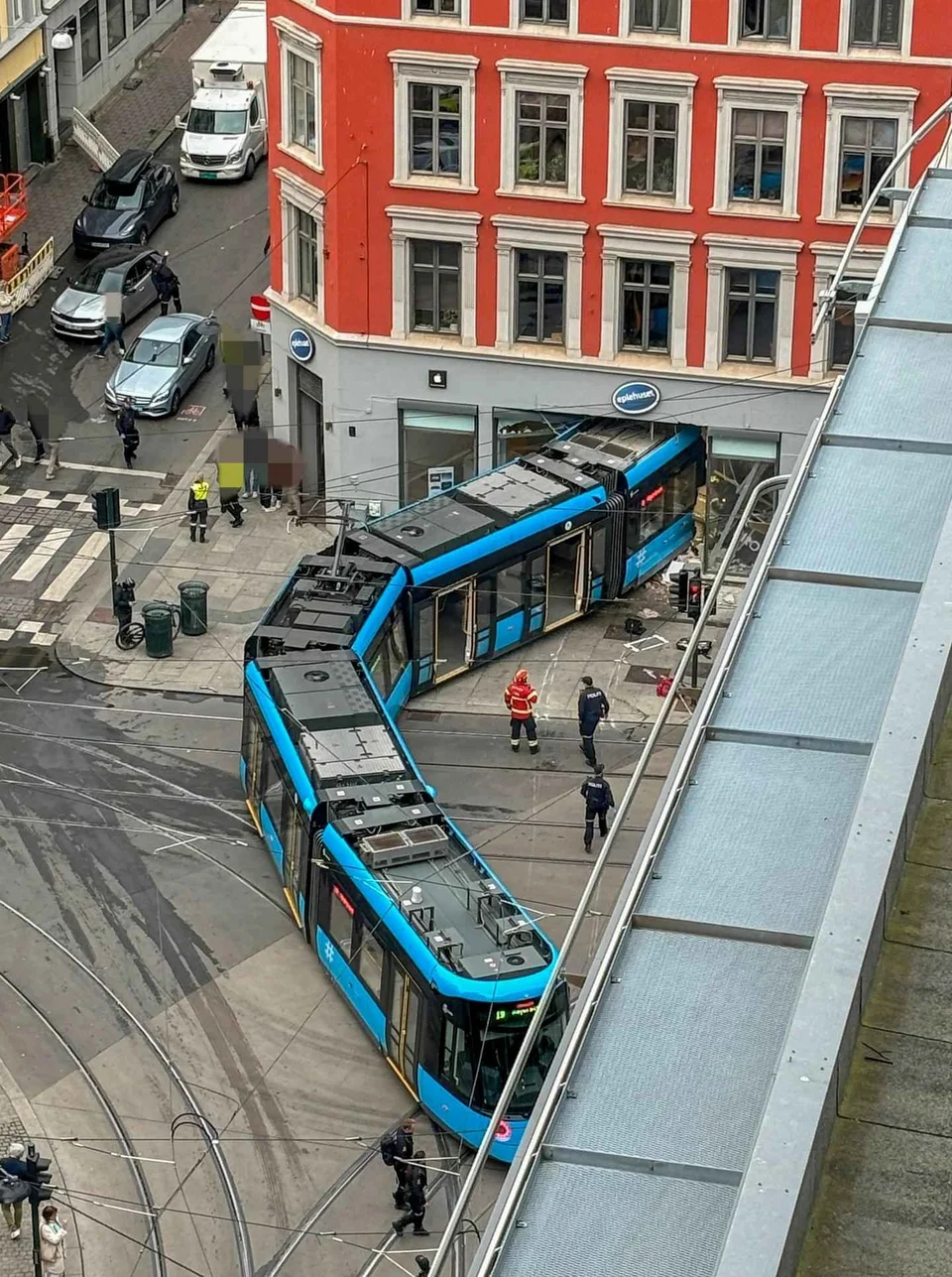 «Πριν από λίγα λεπτά λάβαμε μια αναφορά ότι ένα τραμ έπεσε πάνω σε ένα κατάστημα στην οδό Storgata » δήλωσε ο διευθυντής επιχειρήσεων της αστυνομίας στο νορβηγικό μέσο VG. «Το τραμ εκτροχιάστηκε και έπεσε στο κατάστημα Eplehuset. Εργαζόμαστε για να έχουμε μια εικόνα της έκτασης των ζημιών, αλλά το κατάστημα έχει υποστεί σοβαρές ζημιές».