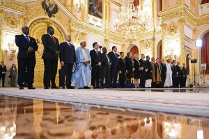 Φτάνοντας για να μιλήσει σε μια διάσκεψη από μια τεράστια χρυσή πόρτα που κοσμούσαν ρωσικές σημαίες, στάθηκε δεκάδες μέτρα μακριά από τους 21 απεσταλμένους και εκφώνησε την ομιλία του από την άλλη πλευρά της μεγάλης αίθουσας, μιλώντας απλώς προς αυτούς.