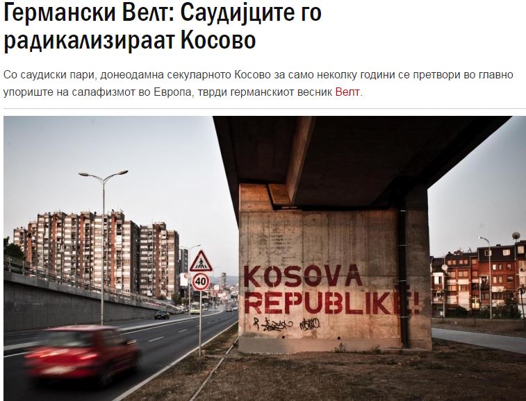 Η γερμανική εφημερίδα «Die Welt» γράφει ότι «με σαουδαραβικά χρήματα, το μέχρι πρόσφατα κοσμικό Κοσσυφοπέδιο, έχει μετατραπεί σε προπύργιο των Σαλαφιστών στην Ευρώπη».