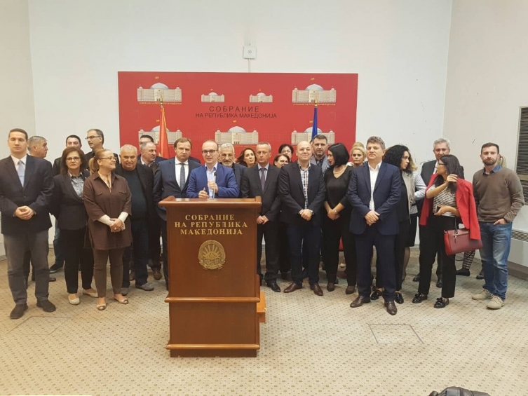 Βουλευτές του VMRO-DPMNE έδωσαν συνέντευξη τύπου ζητώντας από τον πρόεδρο του Κοινοβουλίου, Talat Xhaferi, να ξεκινήσει άμεση η ψηφοφορία.