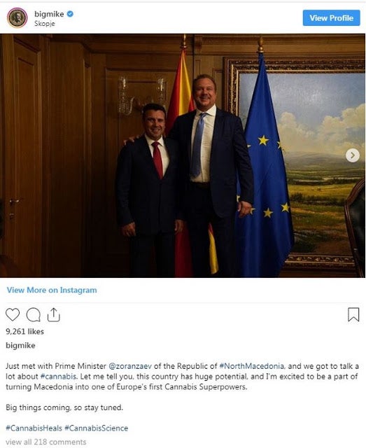 «Μόλις συναντήθηκα με τον πρωθυπουργό Ζόραν Ζάεφ της Δημοκρατίας της Βόρειας Μακεδονίας και μιλήσαμε αρκετά για την κάνναβη. Να σας πω, αυτή η χώρα έχει τεράστιες δυνατότητες και είμαι ενθουσιασμένος να είμαι ένα μέρος της μετατροπής της ‘Μακεδονίας’ στις πρώτες υπερδυνάμεις της Κάνναβης στην Ευρώπη», έγραψε ο Μπιγκ Μάικ στο Ίνσταγκραμ.