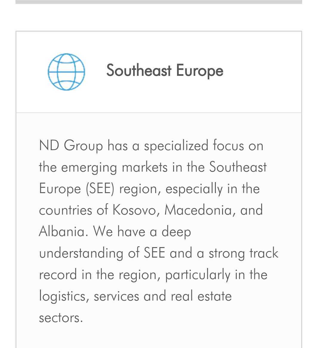 «Ο Όμιλος ND έχει εστιάσει στις αναδυόμενες αγορές στην περιοχή της Νοτιοανατολικής Ευρώπης (ΝΑΕ), ιδίως στις χώρες του Κοσσυφοπεδίου, της Μακεδονίας και της Αλβανίας. Έχουμε μια βαθιά κατανόηση της ΝΑΕ και ένα ισχυρό ιστορικό στην περιοχή, ιδιαίτερα στους τομείς της εφοδιαστικής, των υπηρεσιών και των ακινήτων».