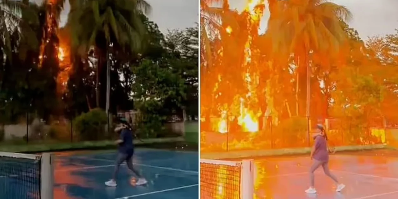 Οι δραματικές στιγμές καταγράφηκαν σε βίντεο. Σε αυτό, φαίνεται η Nana να εξασκείται όταν ξαφνικά λίγα μέτρα μακριά της ένας κεραυνός χτύπησε το ψηλότερο δέντρο προκαλώντας φλόγες. Εμφανώς συγκλονισμένη από το περιστατικό, η γυναίκα έριξε τη ρακέτα της στο γήπεδο και κάλυψε τα αυτιά της.