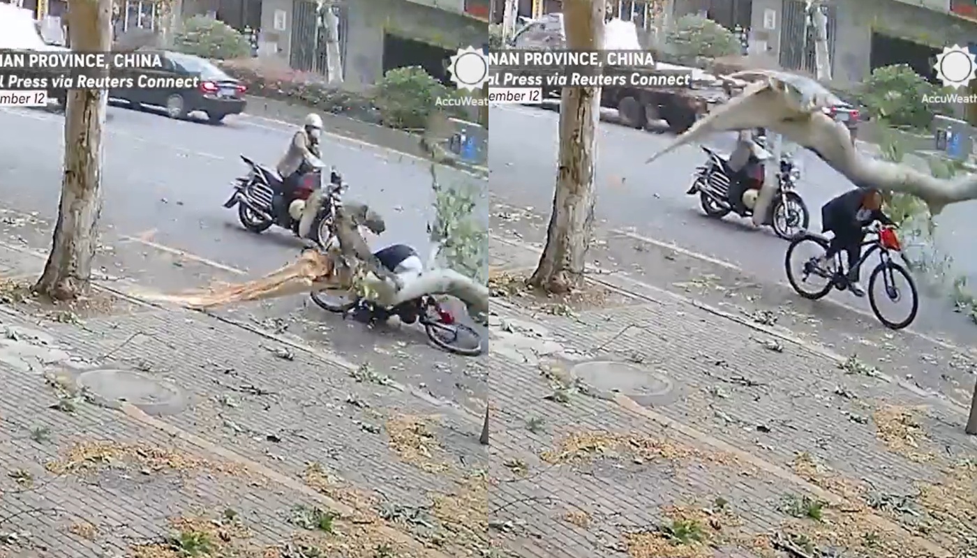 Παραλίγο να σημειωθεί τραγωδία στην Κίνα, όταν ένα κλαδί δέντρου έσπασε και καταπλάκωσε έναν ποδηλάτη.