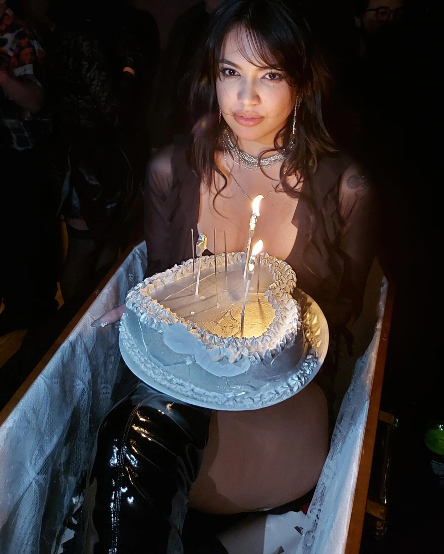Παρά το πένθιμο κλίμα που ήθελε να πετύχει για το πάρτι της, η Γκερβάζιο φρόντισε να τηρήσει τουλάχιστον μια παράδοση από τα συμβατικά πάρτι γενεθλίων, και έτσι έκοψε μια τούρτα σε σχήμα καρδιάς αντί να προσφέρει… κόλλυβα.