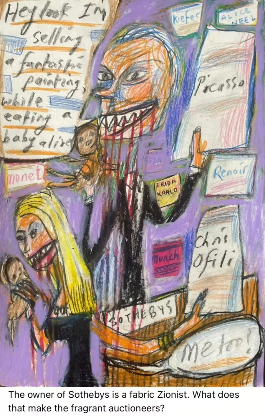 Σύμφωνα με την Telegraph, στην έκθεση παρουσιάστηκαν εκατοντάδες ιδιαίτερα σκληρές και προκλητικές εικόνες. Σε ένα από τα σκίτσα, εμφανίζονταν δύο δημοπράτες του οίκου Sotheby’s –που ανήκει στον Γάλλο-Ισραηλινό επιχειρηματία Πάτρικ Ντράχι– να απεικονίζονται να τρώνε μωρά, με αίμα να στάζει από τα δόντια τους.