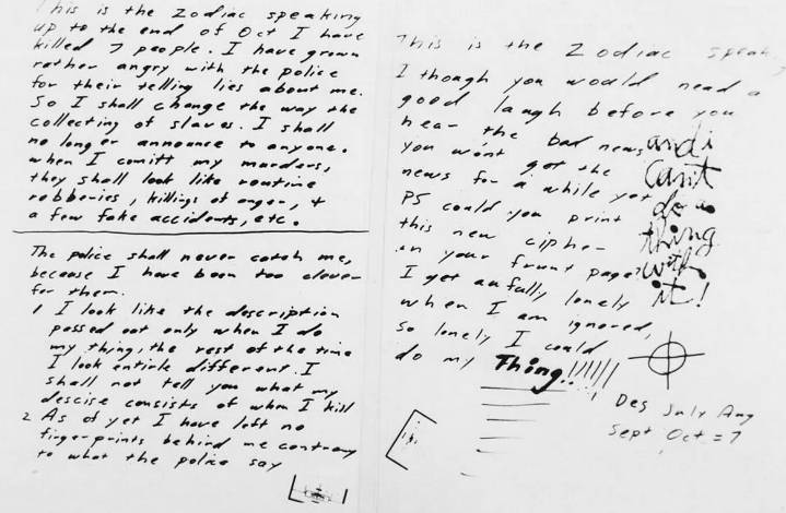 Σε ένα διεστραμμένο παιχνίδι εξουσίας κι απόδειξης της υπεροχής του, ο δολοφόνος επικοινωνούσε με τις αστυνομικές αρχές, στέλνοντας γράμματα σε μεγάλες εφημερίδες της εποχής. Κορόιδευε την αστυνομία με το ειρωνικό ύφος και τα χαρακτηριστικά κρυπτογραφημένα συνημμένα μηνύματα των επιστολών του, που ήταν τόσο περίπλοκα που δεν έχουν αποκωδικοποιηθεί μέχρι και σήμερα. Χαρακτηριστικά σε ένα από αυτά έγραφε «Η αστυνομία δεν θα με συλλάβει ποτέ γιατί είμαι πολύ έξυπνος γι’ αυτούς».