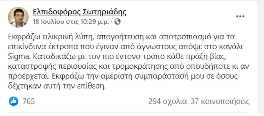 «Εκφράζω ειλικρινή λύπη, απογοήτευση και αποτροπιασμό για τα επικίνδυνα έκτροπα που έγιναν από άγνωστους στο κανάλι Sigma. Καταδικάζω με τον πιο έντονο τρόπο κάθε πράξη βίας, καταστροφής περιουσίας και τρομοκράτησης από οπουδήποτε κι αν προέρχεται. Εκφράζω την αμέριστη συμπαράστασή μου σε όλους όσοι δέχτηκαν αυτή την επίθεση», έγραψε.