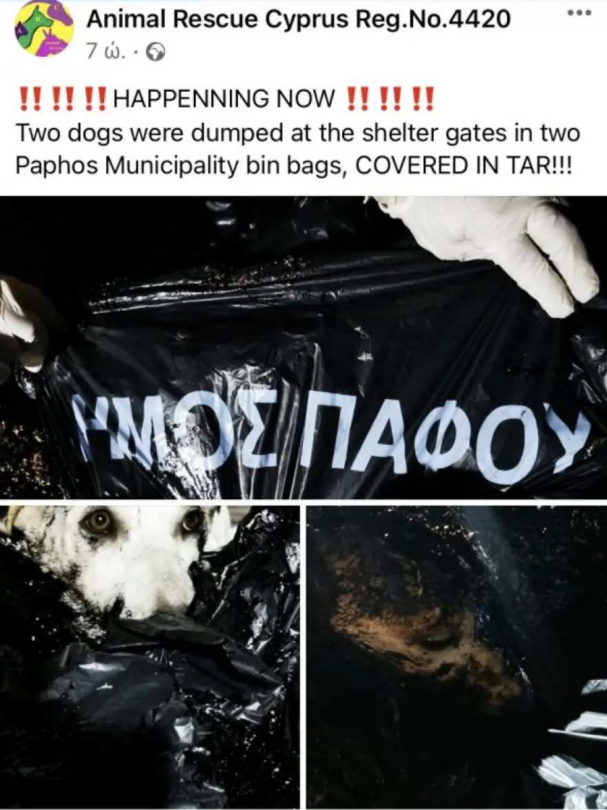 Σύμφωνα με το sigmalive, δύο σκυλάκια εντοπίστηκαν μέσα σε κάδο απορριμμάτων σε μαύρα σακούλια του Δήμου Πάφου και ήταν καλυμμένα με μαύρη πίσσα.