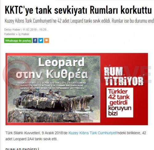 Επιπλέον, η Άγκυρα έχει αποστείλει στην Κύπρο στρατιωτικό εξοπλισμό γερμανικής κατασκευής, καθώς προηγήθηκαν τα αντιαρματικά συστήματα Milan. Ωστόσο, η πρόσφατη ενέργεια χαρακτηρίζεται ως αυξημένης επιχειρησιακής επιτελεστικότητας, αφού, σ’ ένα επιχειρησιακό περιβάλλον με τα μορφολογικά και γεωγραφικά δεδομένα της Κύπρου, ο συγκεκριμένος τύπος άρματος, στους συγκεκριμένους αριθμούς, μπορεί να αποβεί καταλυτικός.