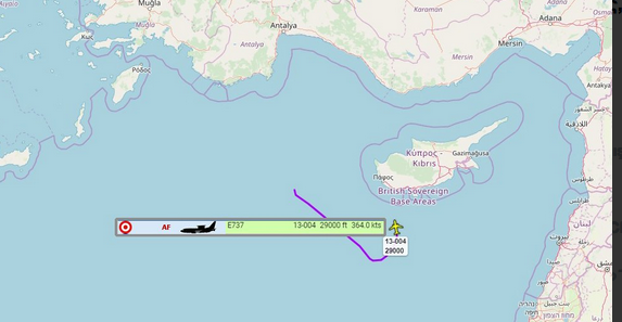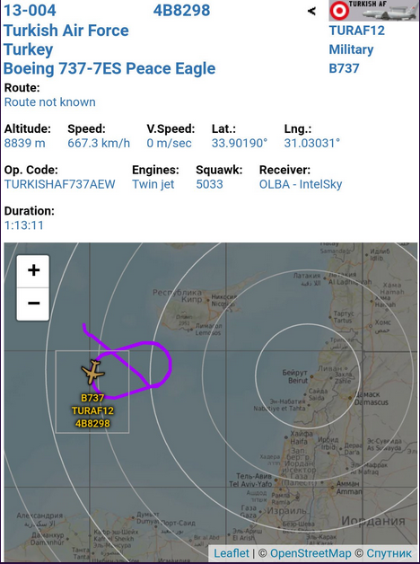 Ταυτόχρονα, τουρκικό αεροσκάφος έγκαιρης προειδοποίησης, Boeing 737-7ES 13-004 με χαρακτηριστικό κλήσης TURAF12 ICAO: 4B8298 εντοπίστηκε νότια της νήσου Κύπρου